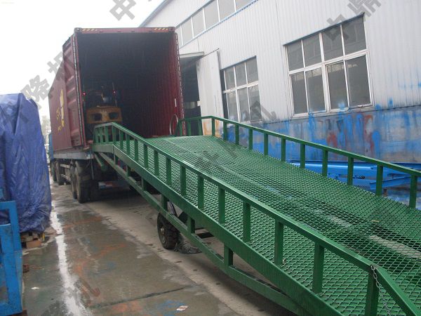 移動登車橋的工作順序:把登車橋牽引至指定裝卸地點----用擠輪塊把輪胎擠住定位-----壓動手壓泵(把橋身壓升到裝卸車輛車盤面的高度)---把車輛裝卸口對準橋頭搭車舌板進行對接----對接完成打開泄壓閥使液壓油缸泄壓(橋身全部無支撐力搭接在車箱上)--用止退鎖鏈把橋身與車廂鏈接鎖住---叉車進行裝卸工作---裝卸完畢---打開鏈接鎖鏈---壓動手壓泵把橋體升起----車輛開走----打開液壓泄壓閥(橋體回落到自身高度)---牽引車將其拉走!