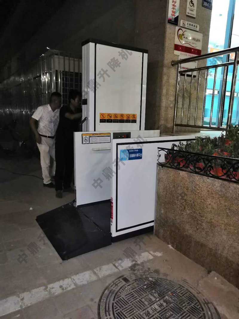 無障礙升降平臺,主要是由軌道和升降臺板組成的,類似一個簡易的小電梯。軌道是鑲嵌在通道出入口的墻壁上的,隨著樓梯的坡度向下延伸,一直到地道內部。